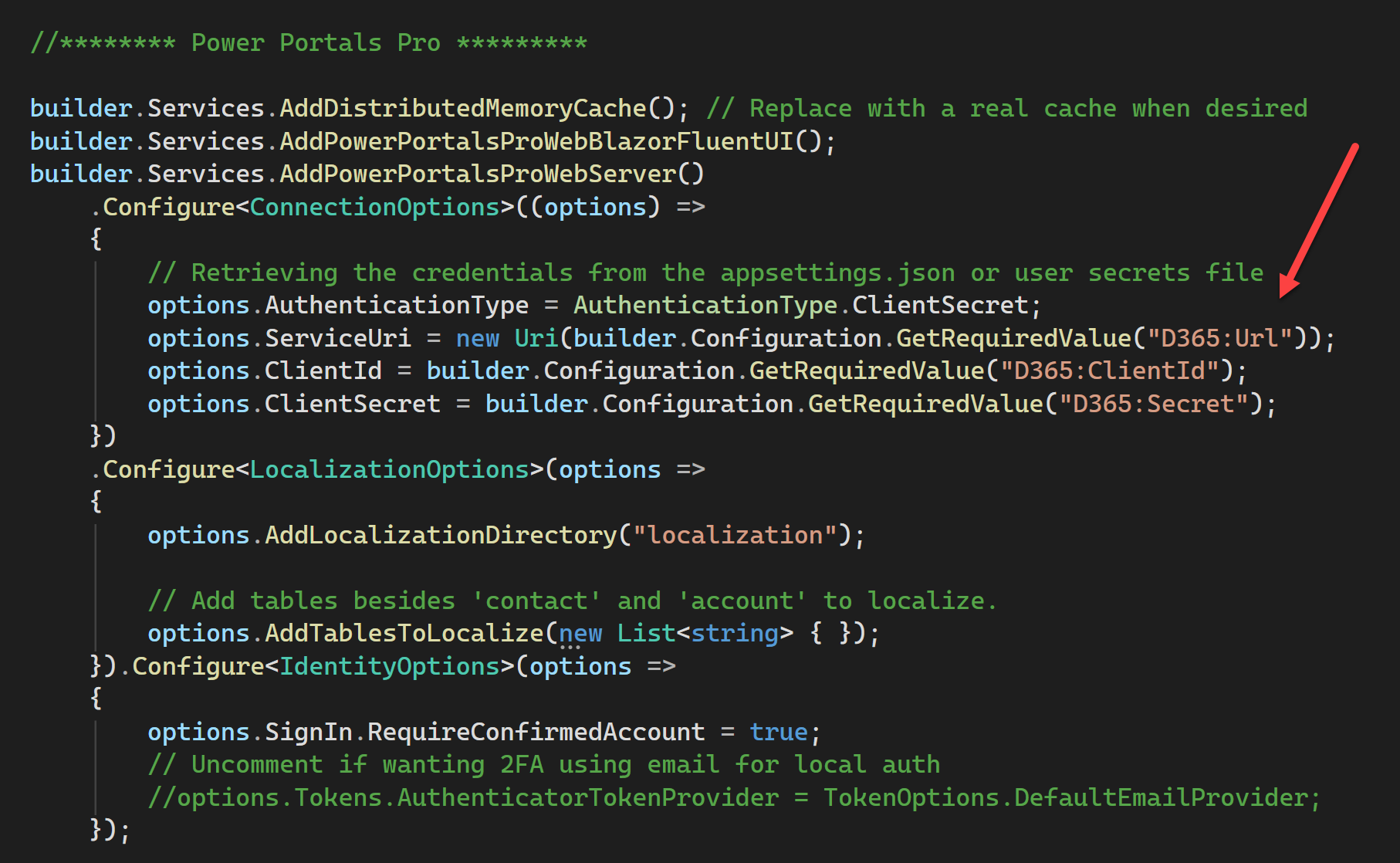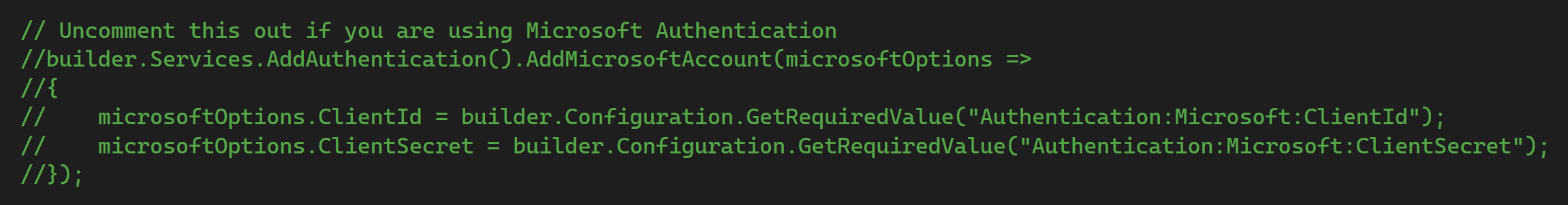 To enable user authentication with Azure Entra ID, uncomment the following code in the 'Program.cs' file: