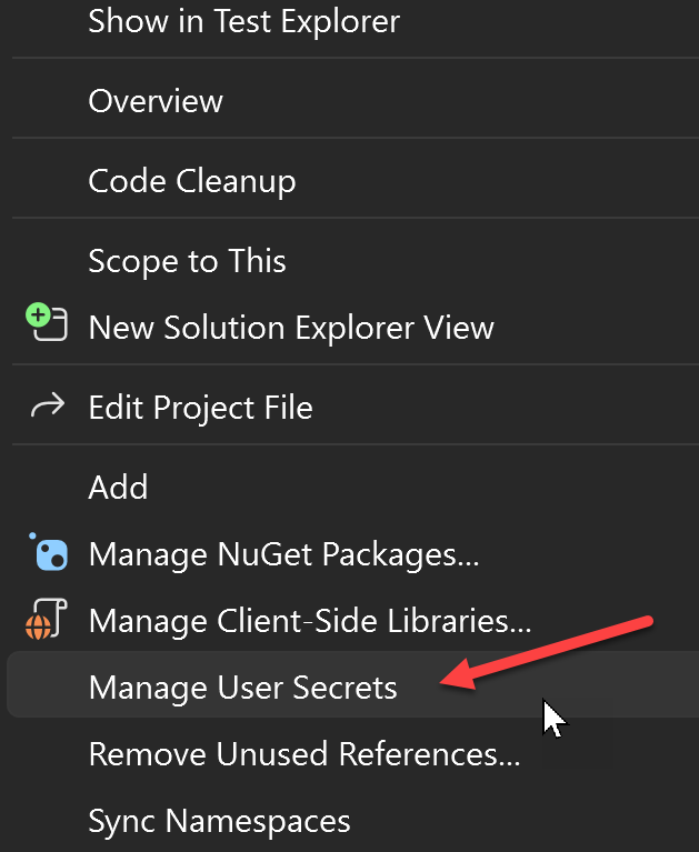 For security best practices, store your credentials in the 'User Secrets' file. Right-click on the project file and select 'Manage User Secrets':